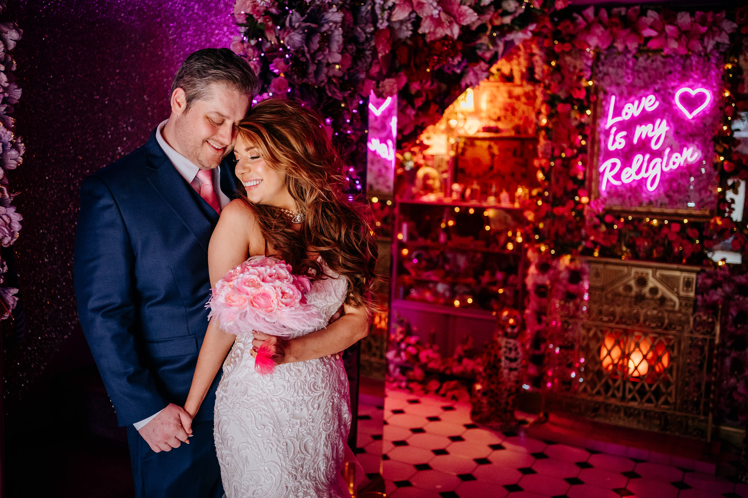 From the moment I arrived, it was clear this was going to be a fun one. Every room felt like a new backdrop, and photographing the couple around the house — especially with the LED sign and some of the more outrageous settings — was an absolute dream. It’s the kind of venue where you don’t need to “find” interesting spots, they’re just everywhere you look.